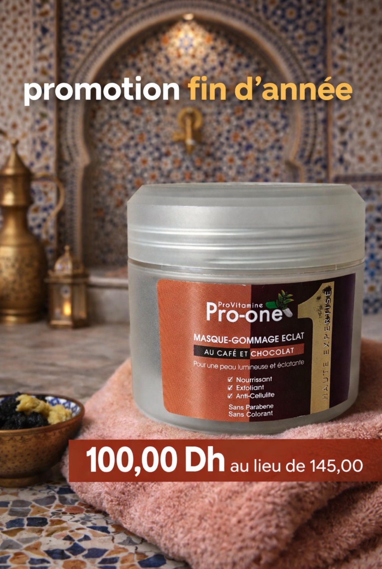 Offrez à votre peau un véritable rituel de hammam marocain avec le masque-gommage Pro-One au café et chocolat. Sa formule riche aide à exfolier en douceur, nourrir la peau et lui redonner éclat et douceur.