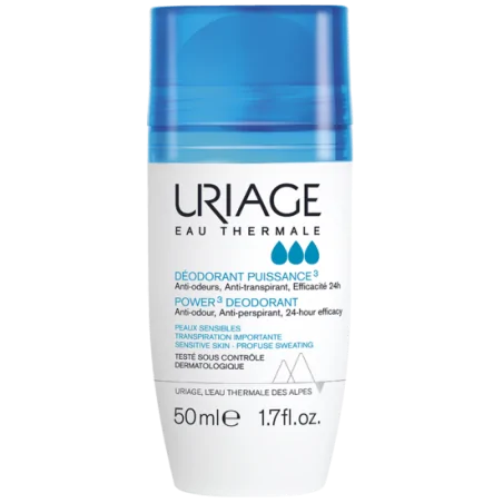 URIAGEDéodorant Puissance 3Anti-odeursAnti-transpirantEfficacité 24hTranspiration importante Peaux sensiblesHypoallergénique50mlLe déodorant Uriage Puissance 3 :Régule et limite la prolifération bactérienneAnti- transpirantAnti-odeursApaise et adoucit L’eau thermale d’Uriage et le Bisanolol protègent la barrière cutanée et apaisent.Les petits plus Uriage :Sans alcoolAnti-traces blanches et jaunesPas d’effet carton sur les vêtementsParfum mixte et délicat.Convient parfaitement pour les peaux sensibles, autant pour les femmes que pour les hommes. Conseils d’utilisationAppliquer 1 à 2 fois sous les aisselles tous les matins après la toilette et dès que nécessaire.CompositionFormule INCI : Aqua (Water), Aluminium Chlorohydrate, Butylene Glycol, Dimethicone, Steareth-2, Triethyl Citrate, Steareth-21, Propanediol, Parfum (Fragrance), Polyacrylate Crosspolymer-6 Tetrasodium Edta, Bisabolol, Ethylhexylglycerin, Rhamnose, Butyl Alcohol, Glucose, Glucuronic Acid.